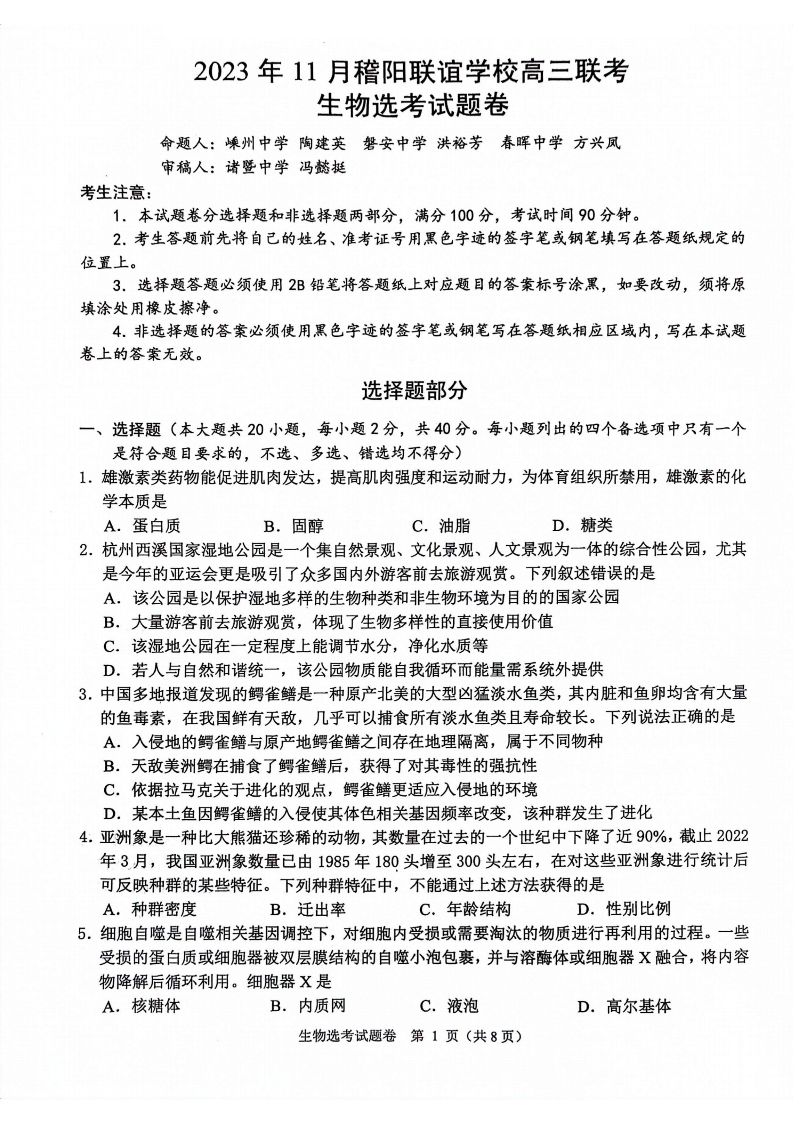 浙江省稽阳联谊学校2023-2024学年高三上学期11月联考 生物