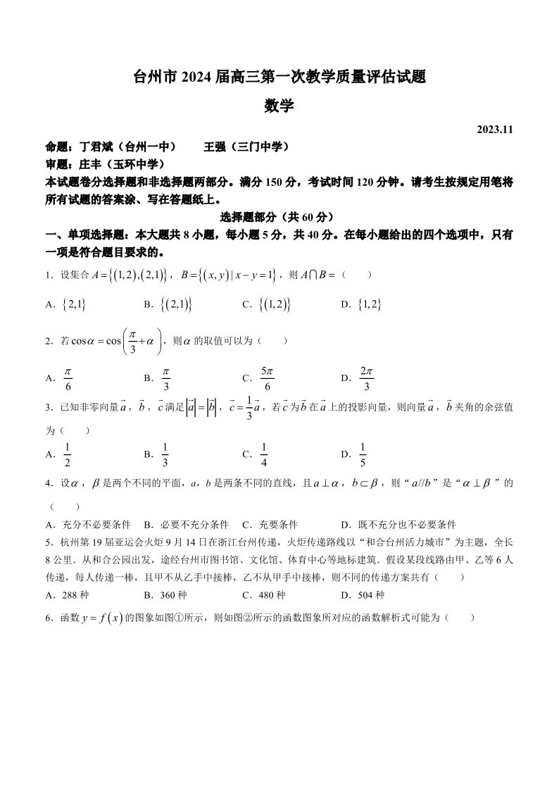 台州市2024届高三第一次教学质量评估试题 数学