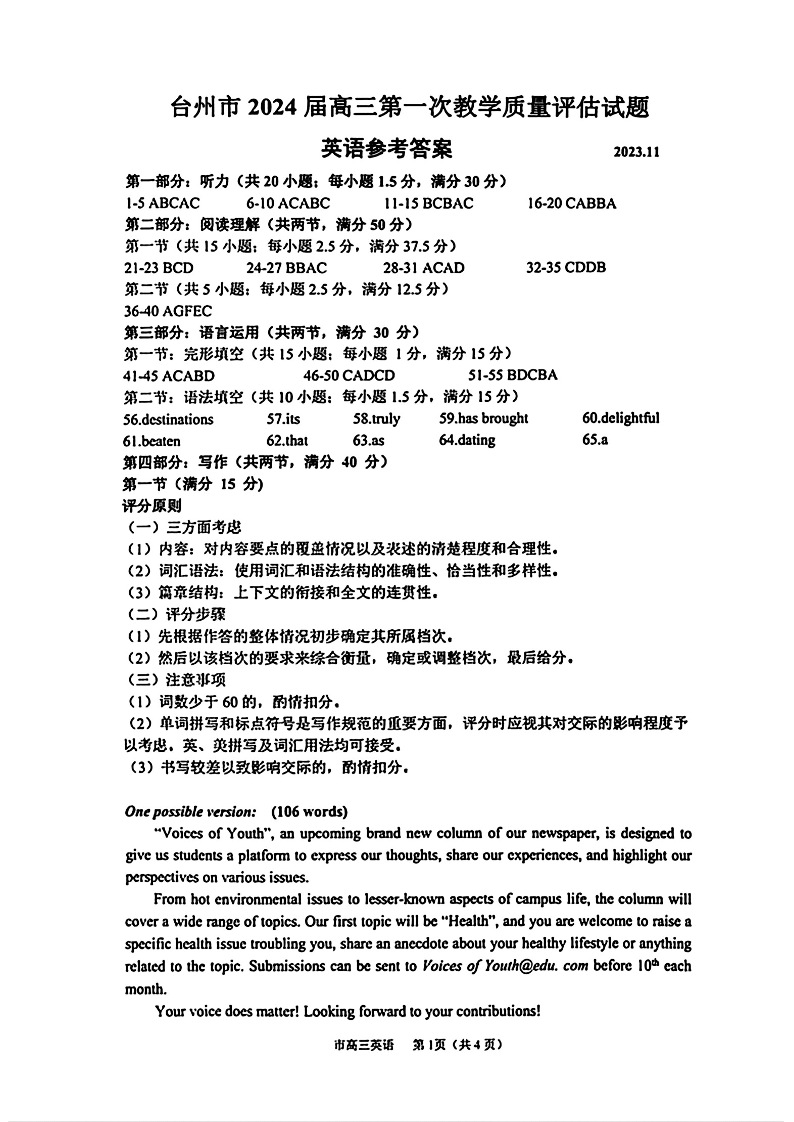 台州市2024届高三第一次教学质量评估试题 英语答案