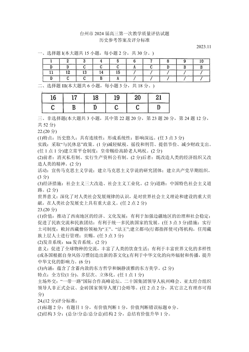 台州市2024届高三第一次教学质量评估试题 历史答案