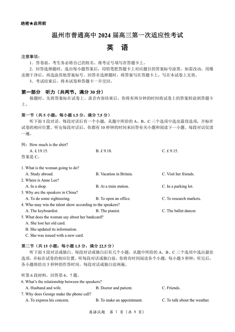 2024届浙江省温州市普通高中高三上学期第一次适应性考试(一模)英语