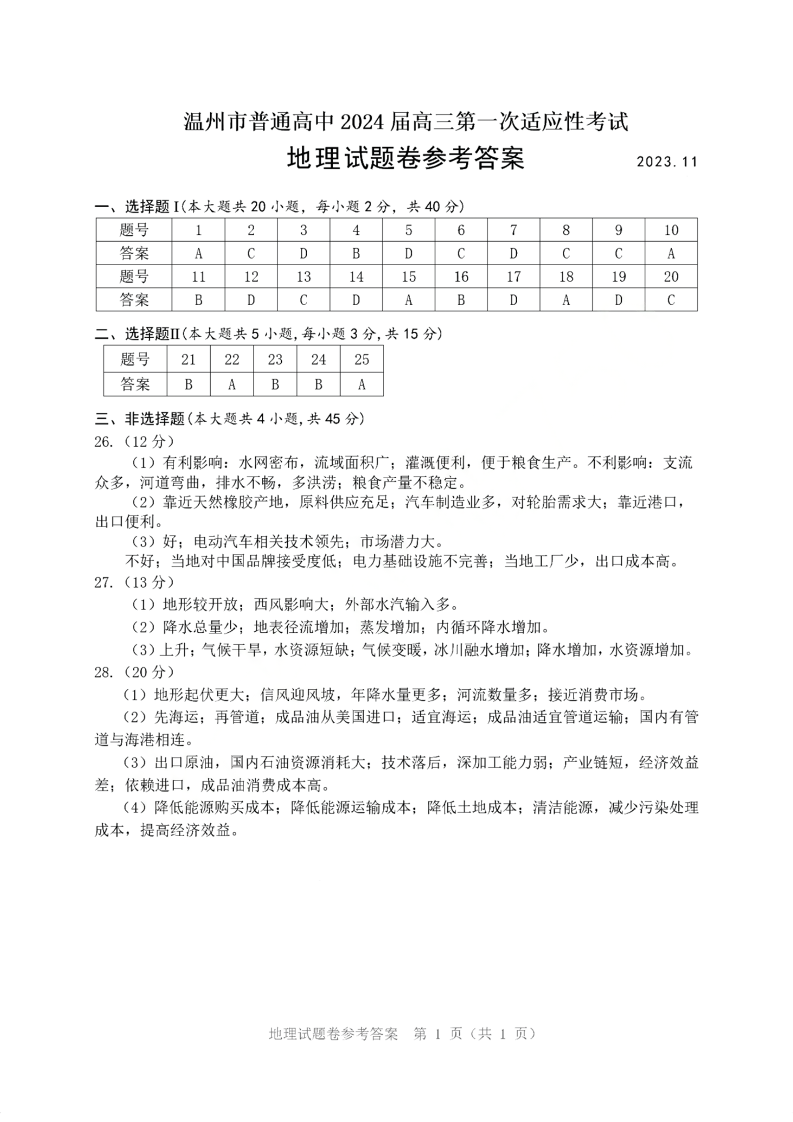 2024届浙江省温州市普通高中高三上学期第一次适应性考试(一模)地理参考答案