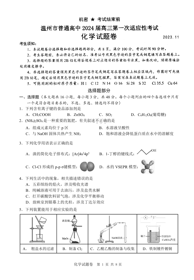 2024届浙江省温州市普通高中高三上学期第一次适应性考试(一模)化学