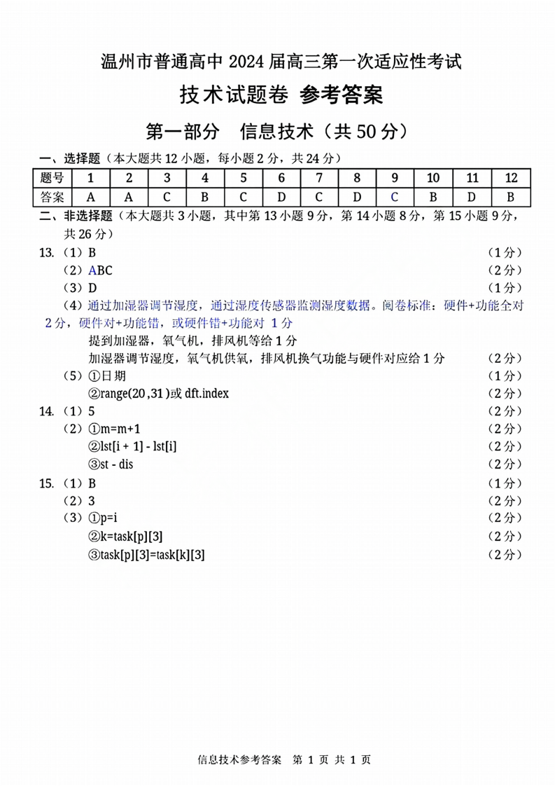 2024届浙江省温州市普通高中高三上学期第一次适应性考试(一模)技术参考答案