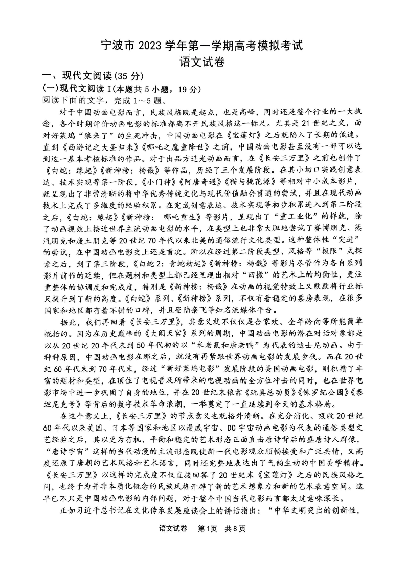 浙江省宁波市2023-2024学年高三上学期选考模拟考试(宁波一模)语文