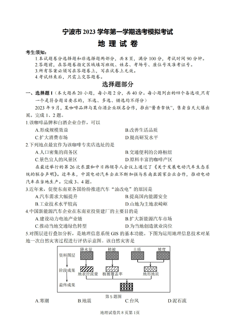 浙江省宁波市2023-2024学年高三上学期选考模拟考试(宁波一模)地理