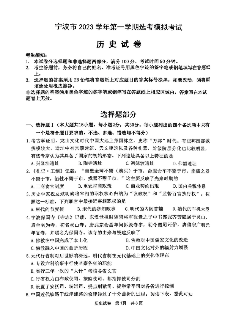 浙江省宁波市2023-2024学年高三上学期选考模拟考试(宁波一模)历史