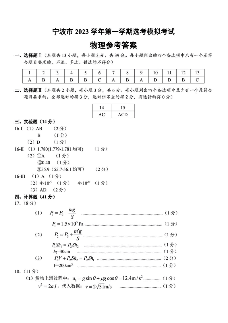 浙江省宁波市2023-2024学年高三上学期选考模拟考试(宁波一模)物理答案