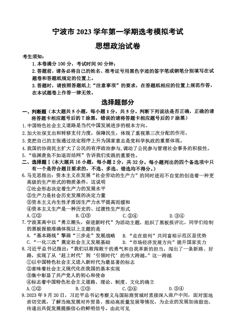 浙江省宁波市2023-2024学年高三上学期选考模拟考试(宁波一模)政治