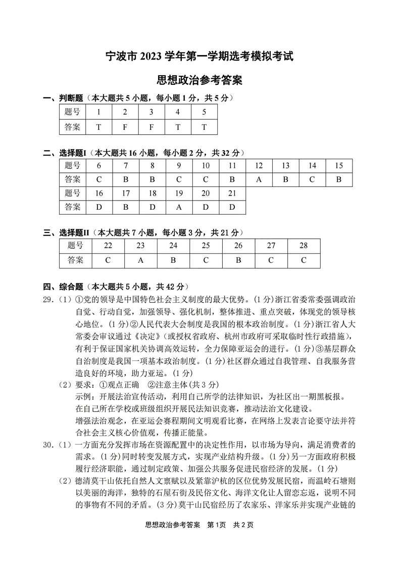 浙江省宁波市2023-2024学年高三上学期选考模拟考试(宁波一模)政治答案
