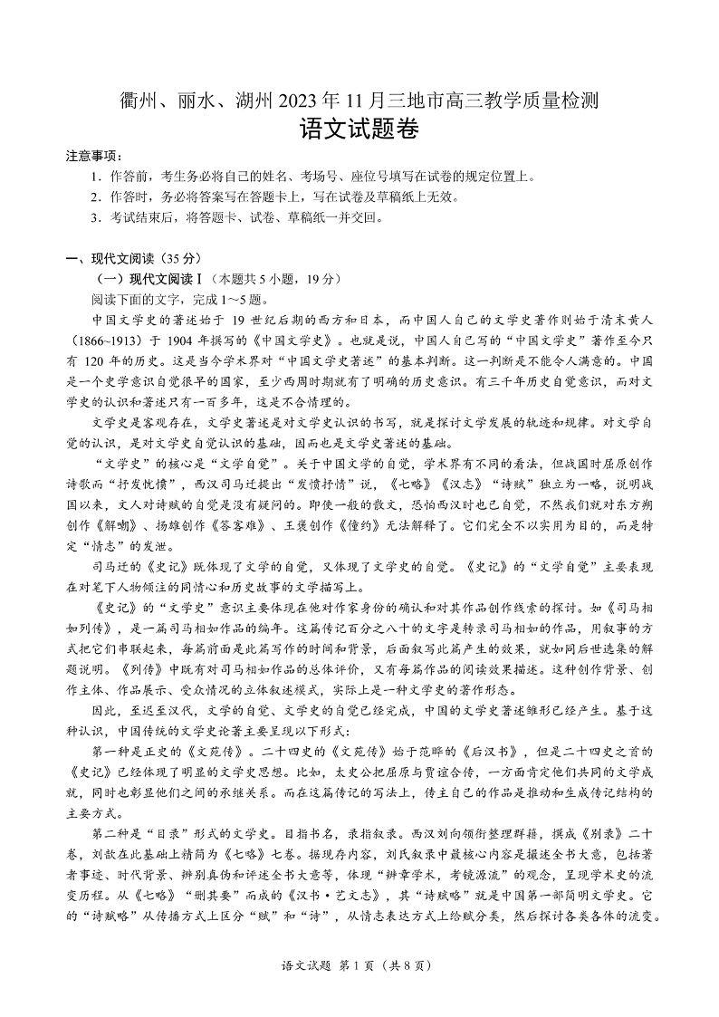 衢州丽水湖州2023年11月三地市高三教学质量检测试 语文