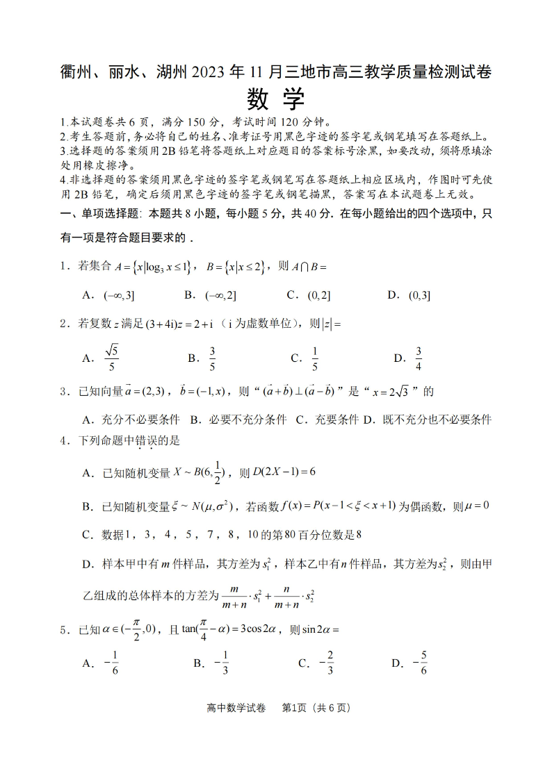 衢州丽水湖州2023年11月三地市高三教学质量检测试 数学