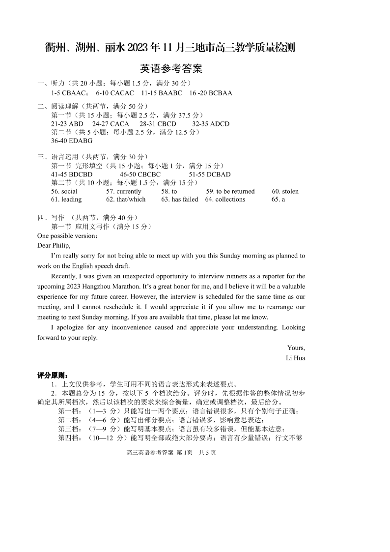 衢州丽水湖州2023年11月三地市高三教学质量检测试 英语答案