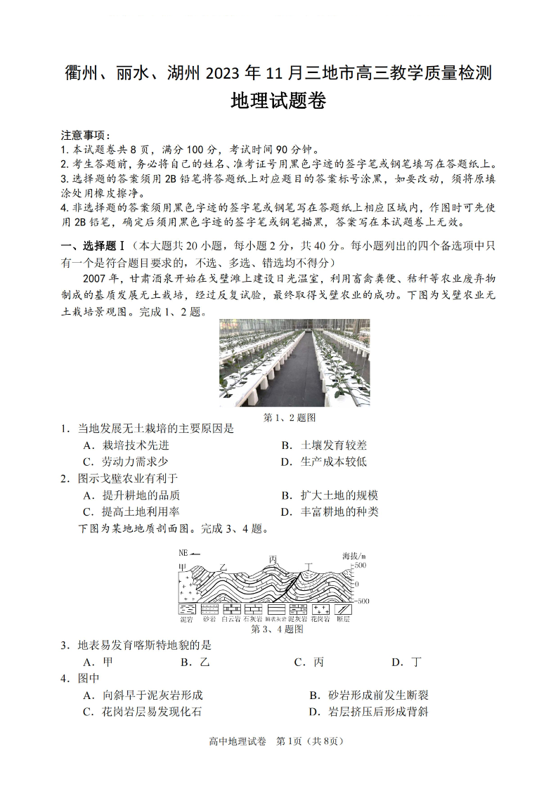 衢州丽水湖州2023年11月三地市高三教学质量检测试 地理