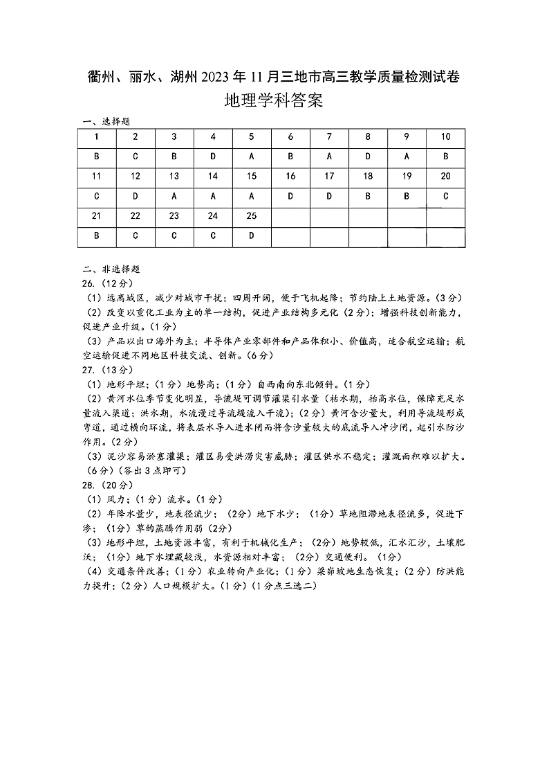 衢州丽水湖州2023年11月三地市高三教学质量检测试 地理答案
