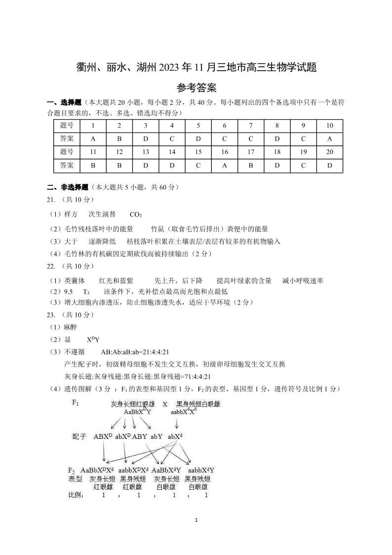 衢州丽水湖州2023年11月三地市高三教学质量检测试 生物答案