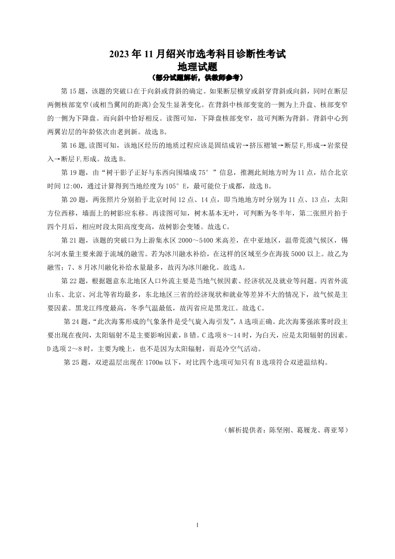 浙江省绍兴市2023-2024学年高三上学期11月选考科目诊断性考试 地理部分试题解析