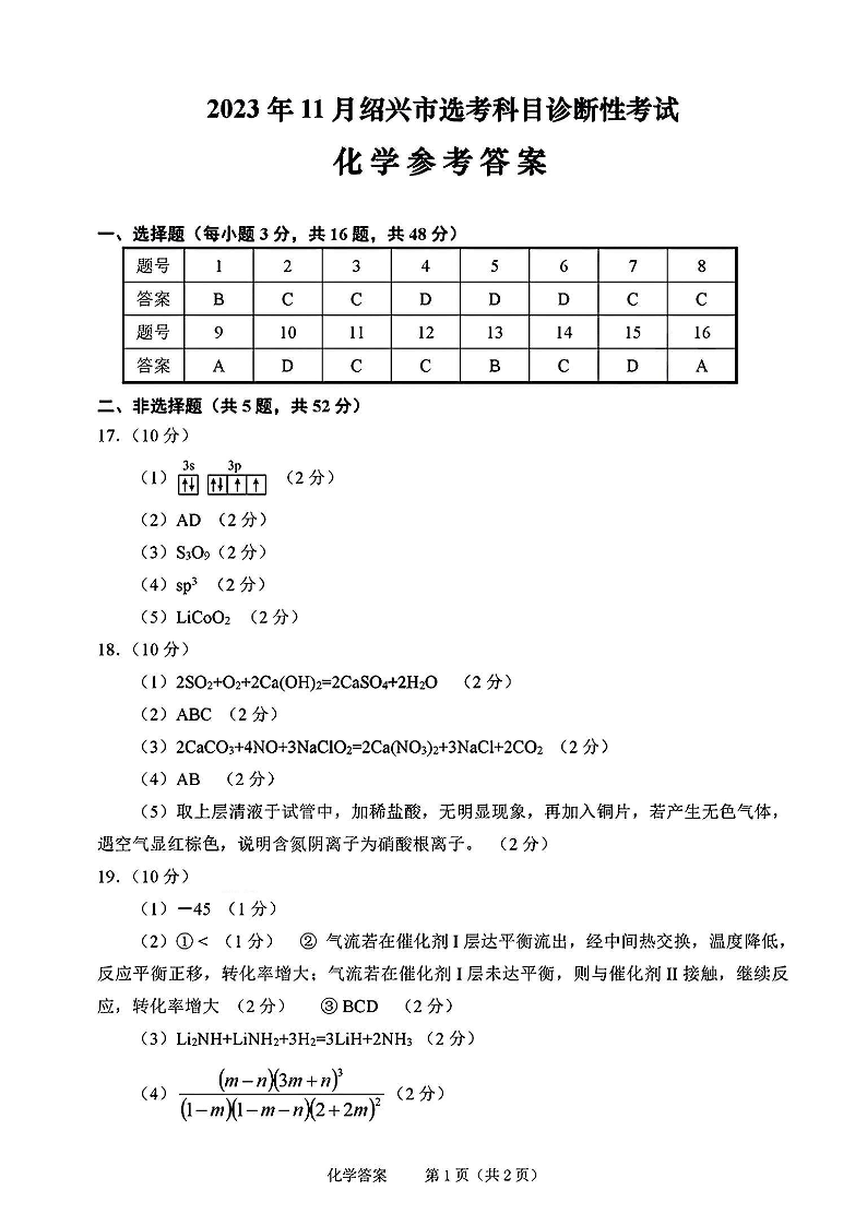 浙江省绍兴市2023-2024学年高三上学期11月选考科目诊断性考试 化学答案