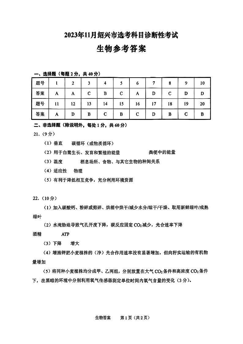 浙江省绍兴市2023-2024学年高三上学期11月选考科目诊断性考试 生物答案