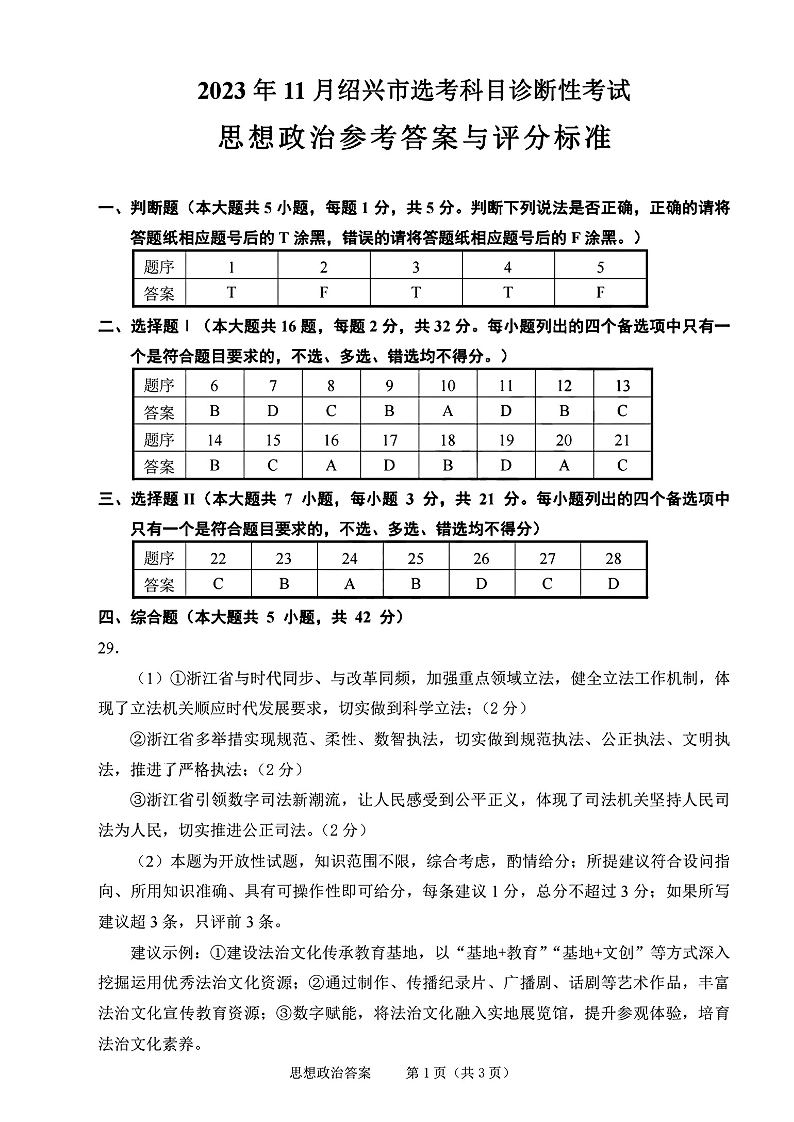 浙江省绍兴市2023-2024学年高三上学期11月选考科目诊断性考试 政治答案