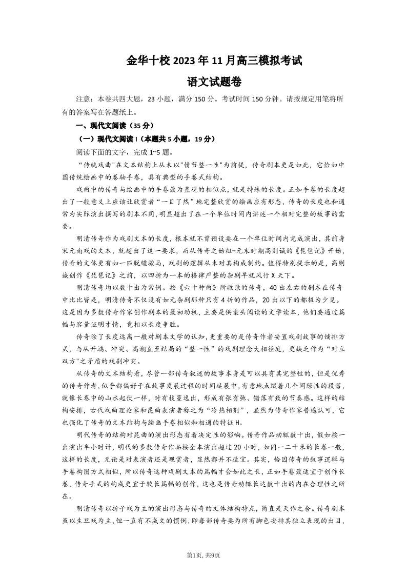 浙江省金华十校2023-2024学年高三上学期11月模拟考试 语文