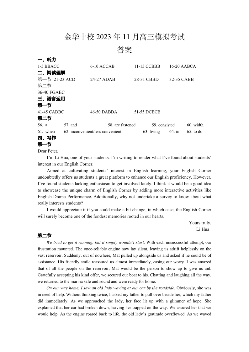 浙江省金华十校2023-2024学年高三上学期11月模拟考试 英语答案