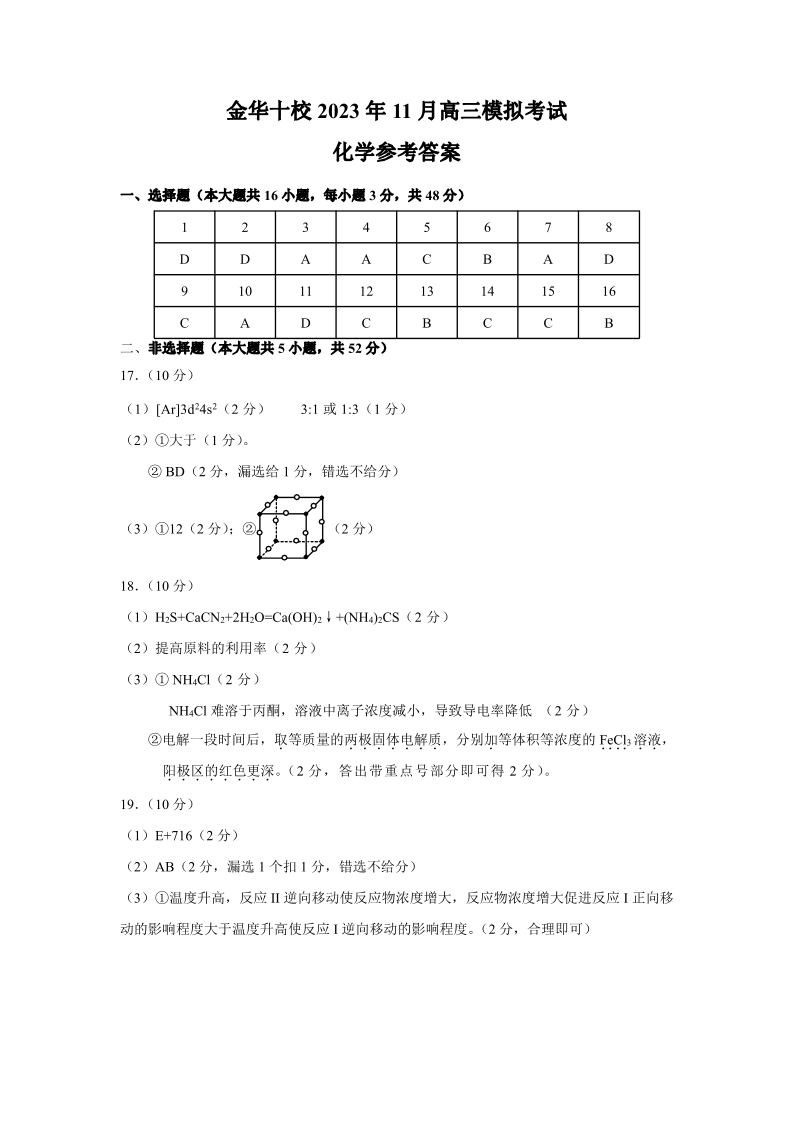 浙江省金华十校2023-2024学年高三上学期11月模拟考试 化学答案