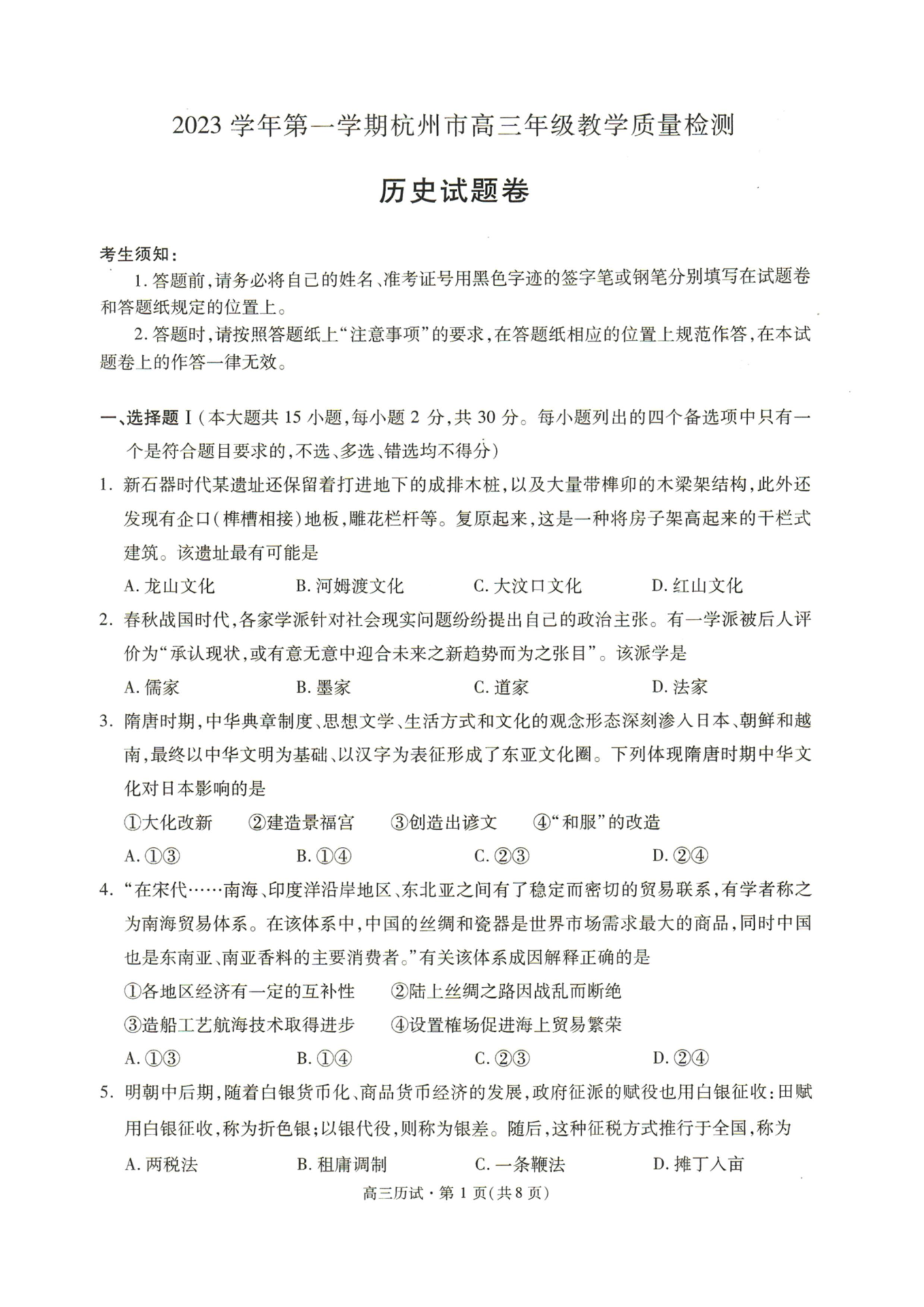 浙江省杭州市2023-2024学年高三上学期期中教学质量检测(一模)历史