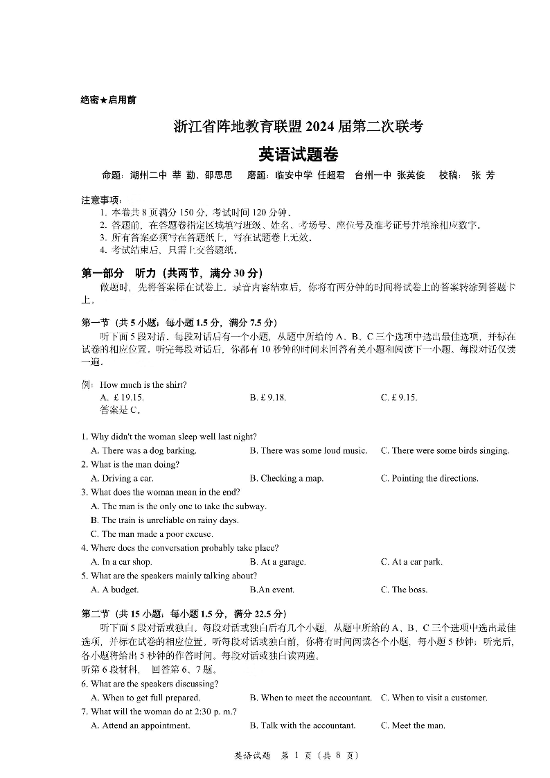 浙江省新阵地教育联盟2023-2024学年高三上学期第二次联考 英语