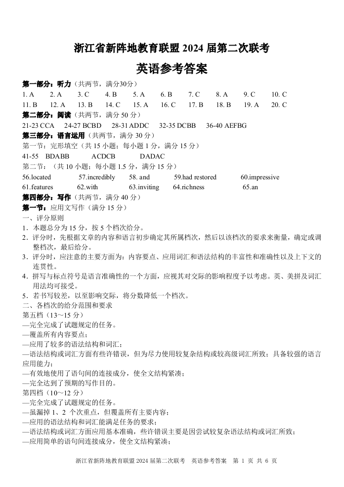 浙江省新阵地教育联盟2023-2024学年高三上学期第二次联考 英语答案
