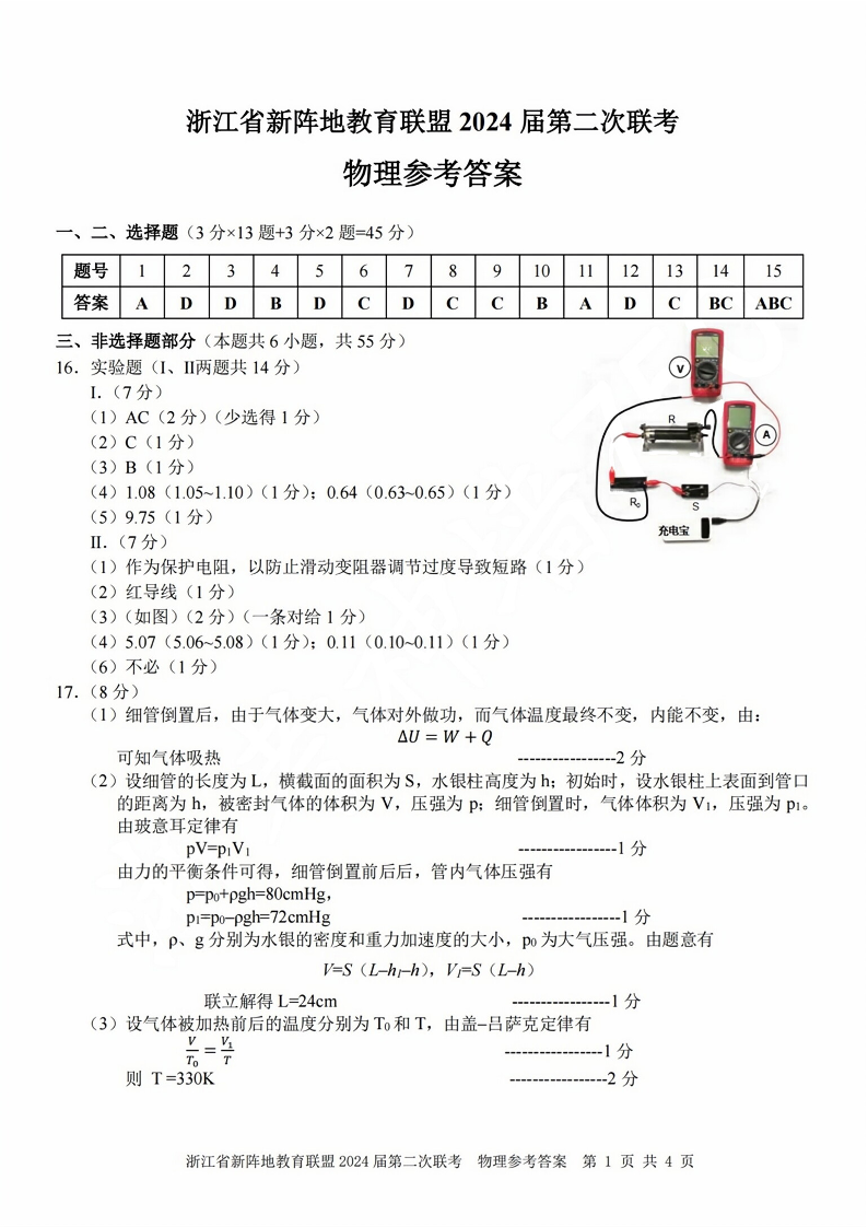 浙江省新阵地教育联盟2023-2024学年高三上学期第二次联考 物理答案