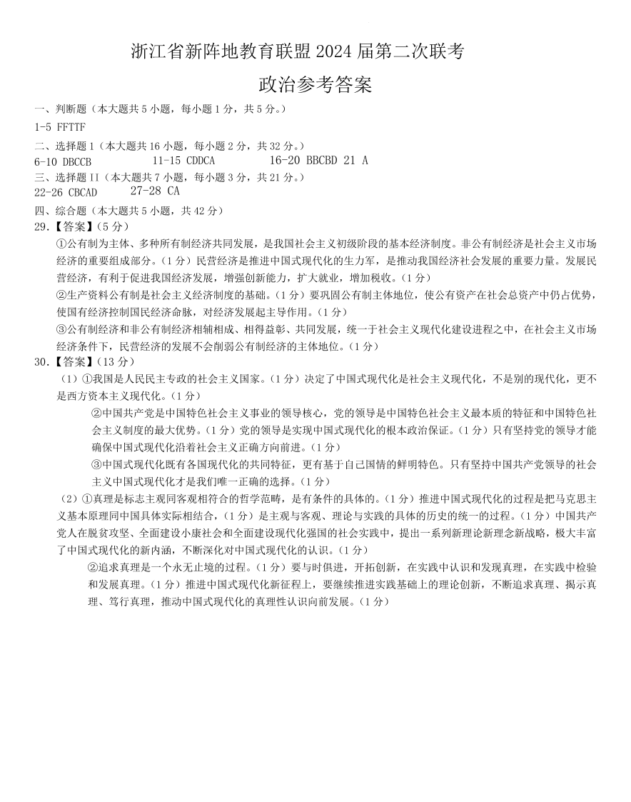 浙江省新阵地教育联盟2023-2024学年高三上学期第二次联考 政治答案