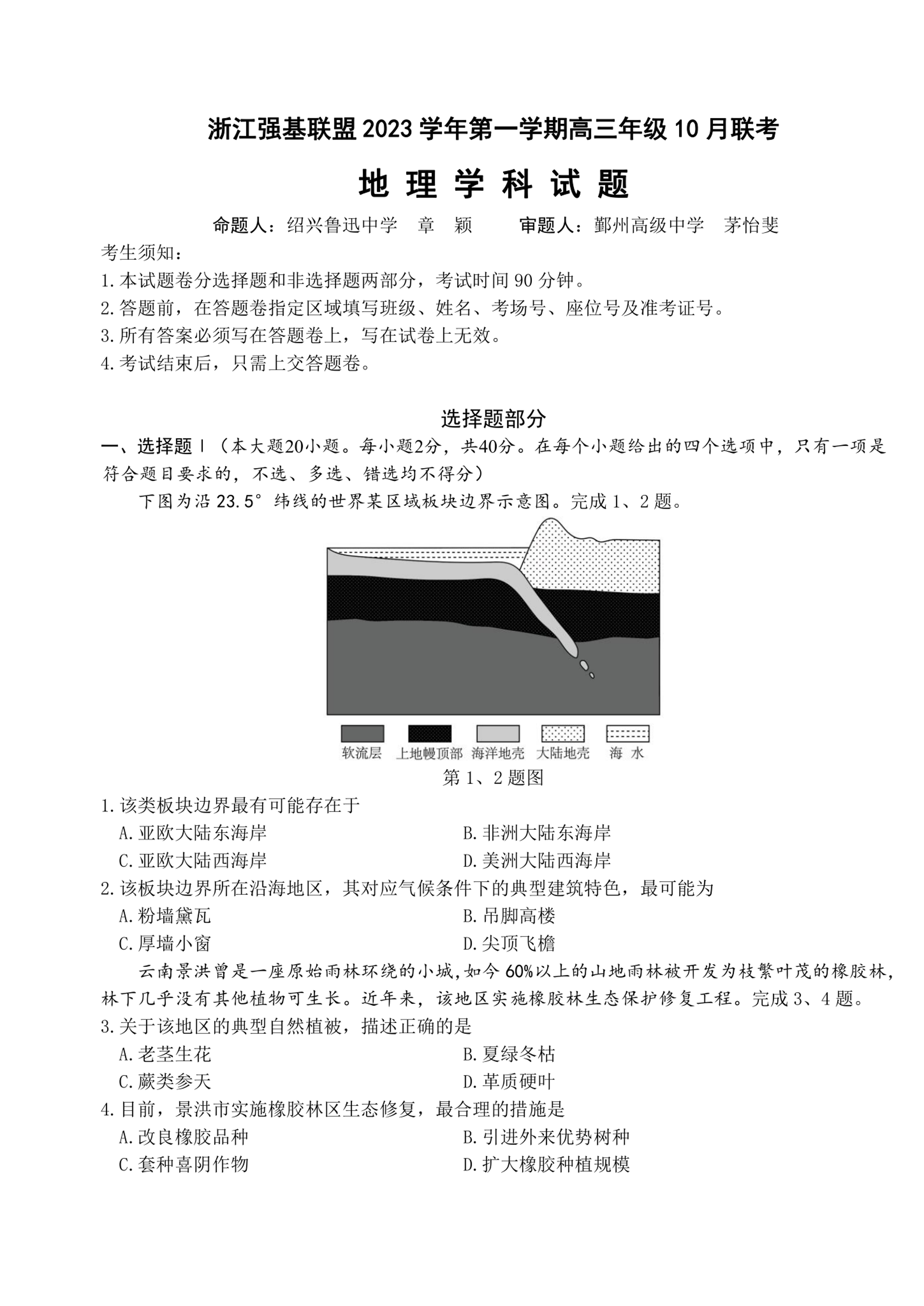浙江强基联盟2023学年第一学期高三年级10月联考 地理