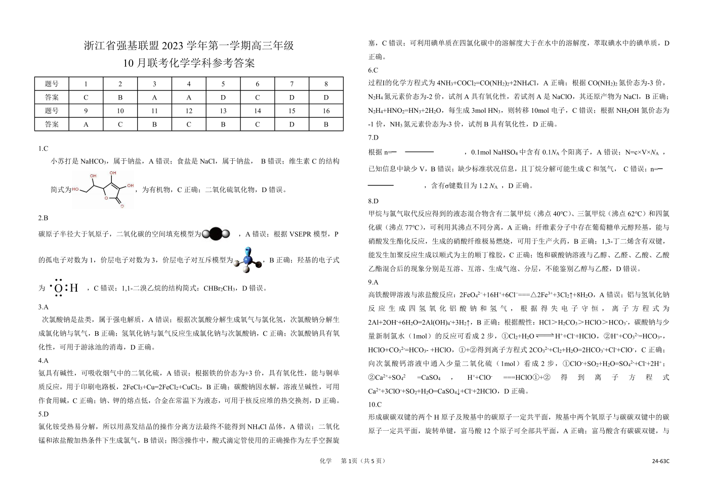 浙江强基联盟2023学年第一学期高三年级10月联考 化学答案