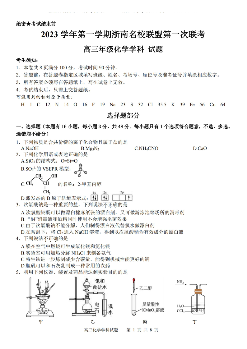 浙江省浙南名校联盟2023-2024学年高三上学期第一次联考 化学