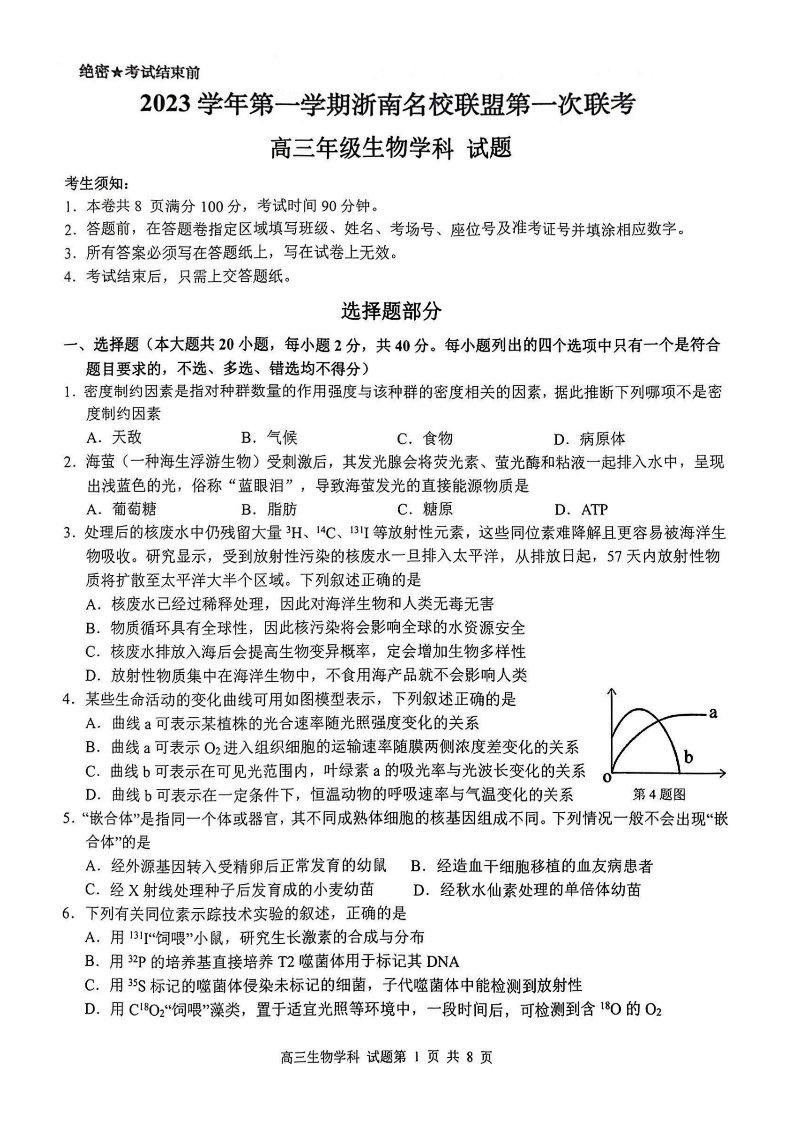 浙江省浙南名校联盟2023-2024学年高三上学期第一次联考 生物