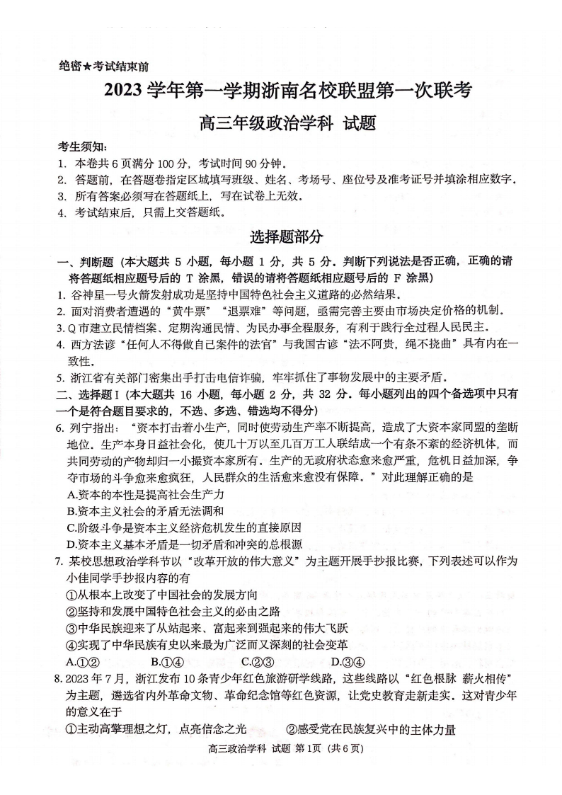 浙江省浙南名校联盟2023-2024学年高三上学期第一次联考 政治