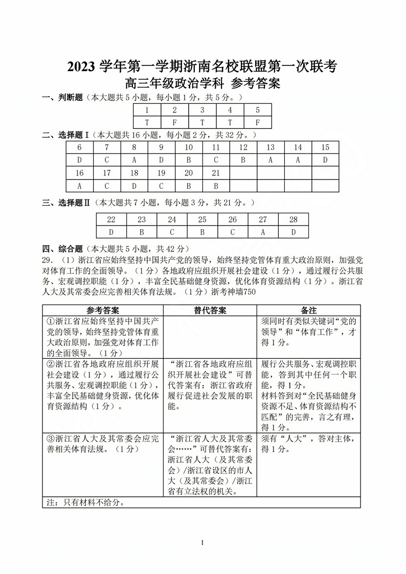 高三年级政治学科参考答案