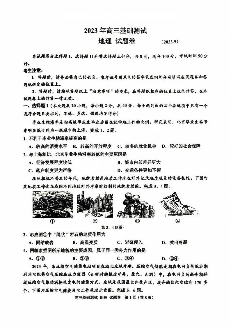浙江省嘉兴市2023年9月高三基础测试 地理试卷及答案