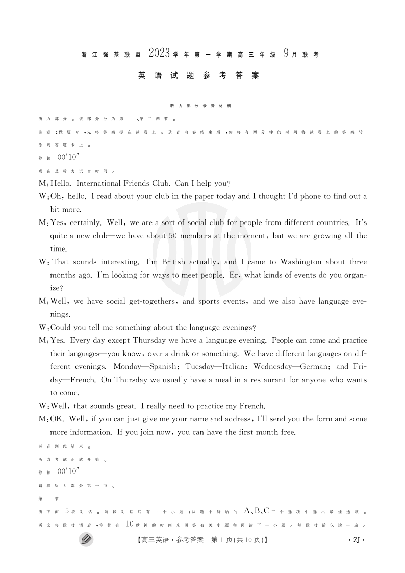 浙江强基联盟2023学年第一学期高三年级9月联考 英语答案