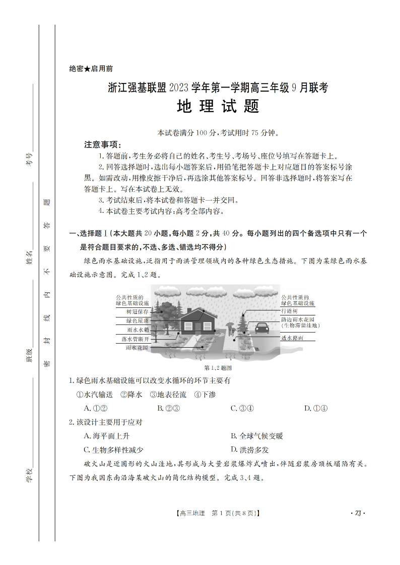 浙江强基联盟2023学年第一学期高三年级9月联考 地理