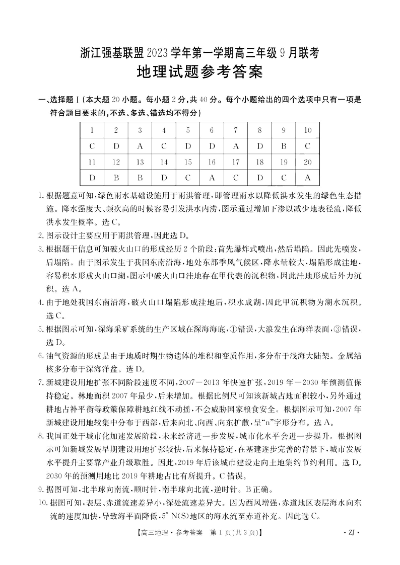 浙江强基联盟2023学年第一学期高三年级9月联考 地理答案