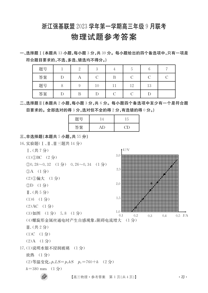 浙江强基联盟2023学年第一学期高三年级9月联考 物理答案