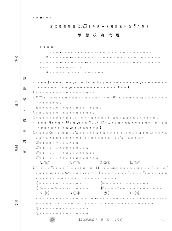 浙江强基联盟2023学年第一学期高三年级9月联考 政治