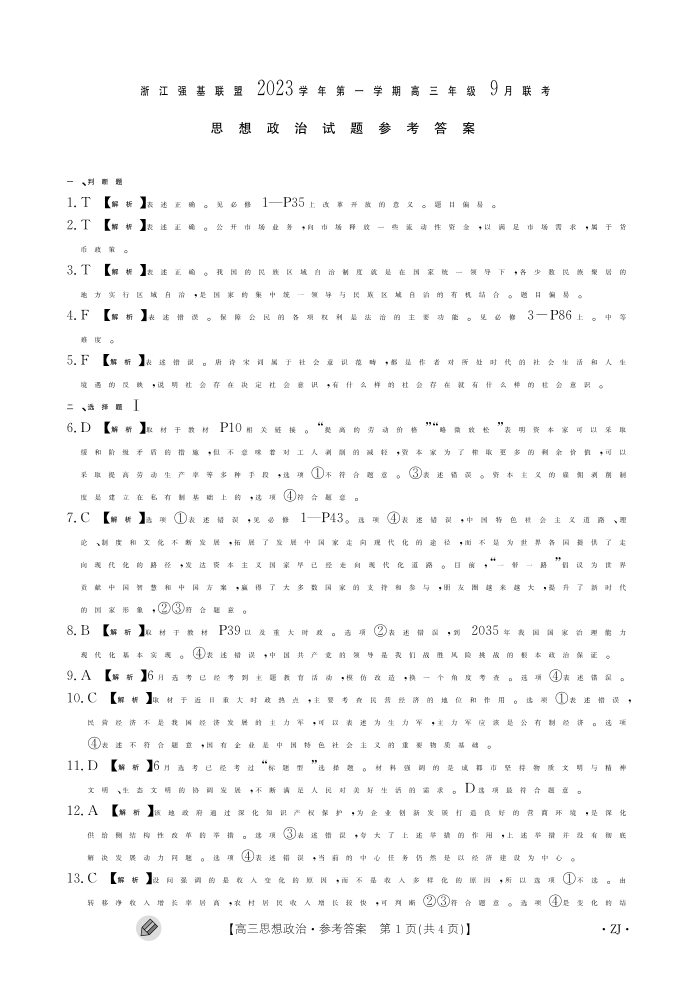 浙江强基联盟2023学年第一学期高三年级9月联考 政治答案