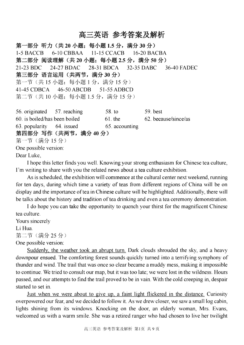 浙江省七彩阳光新高考研究联盟2023-2024学年高三上学期返校联考 英语答案