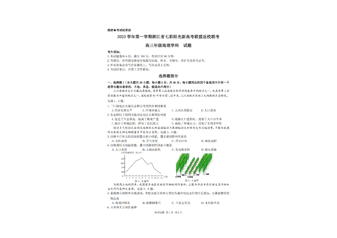 浙江省七彩阳光新高考研究联盟2023-2024学年高三上学期返校联考 地理