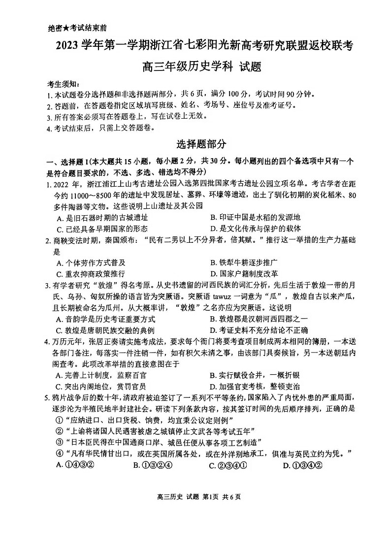 浙江省七彩阳光新高考研究联盟2023-2024学年高三上学期返校联考 历史