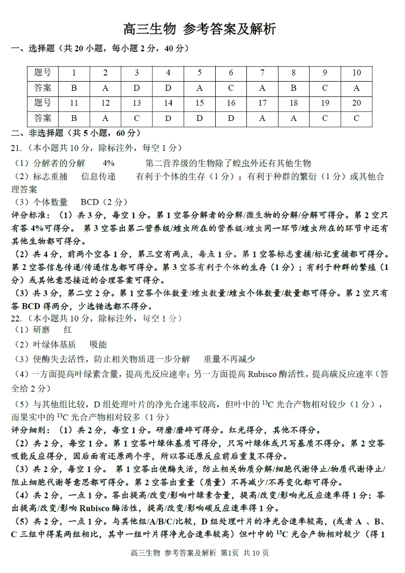 浙江省七彩阳光新高考研究联盟2023-2024学年高三上学期返校联考 生物答案