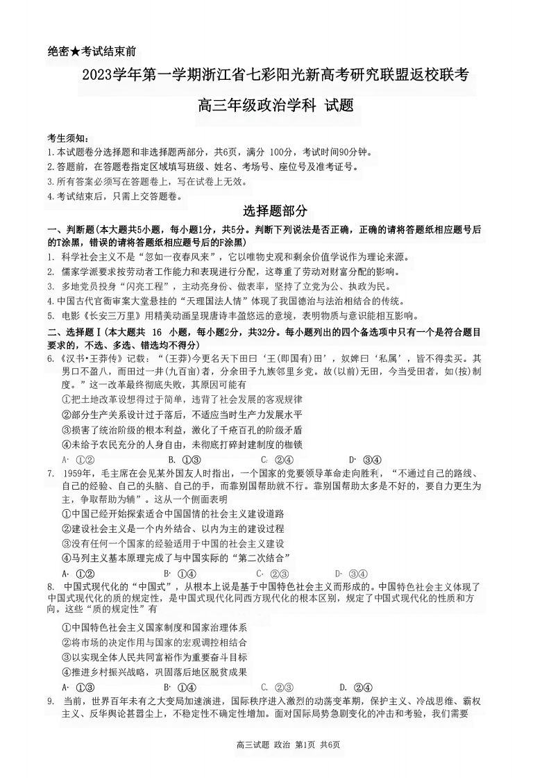 浙江省七彩阳光新高考研究联盟2023-2024学年高三上学期返校联考 政治